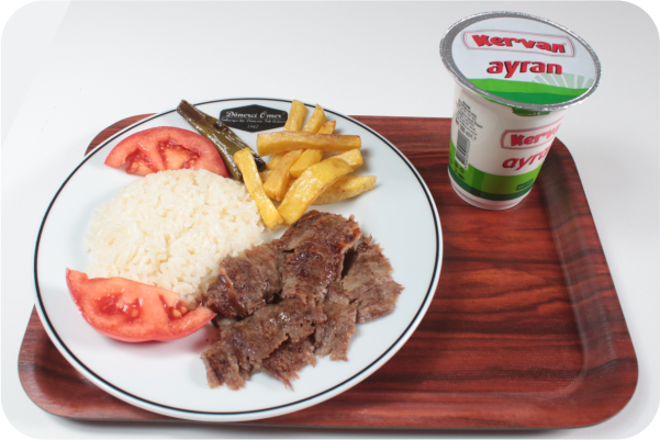 İçindekiler: 50gr Döner, Patates, Ayran, Pilav, Domates, Biber
